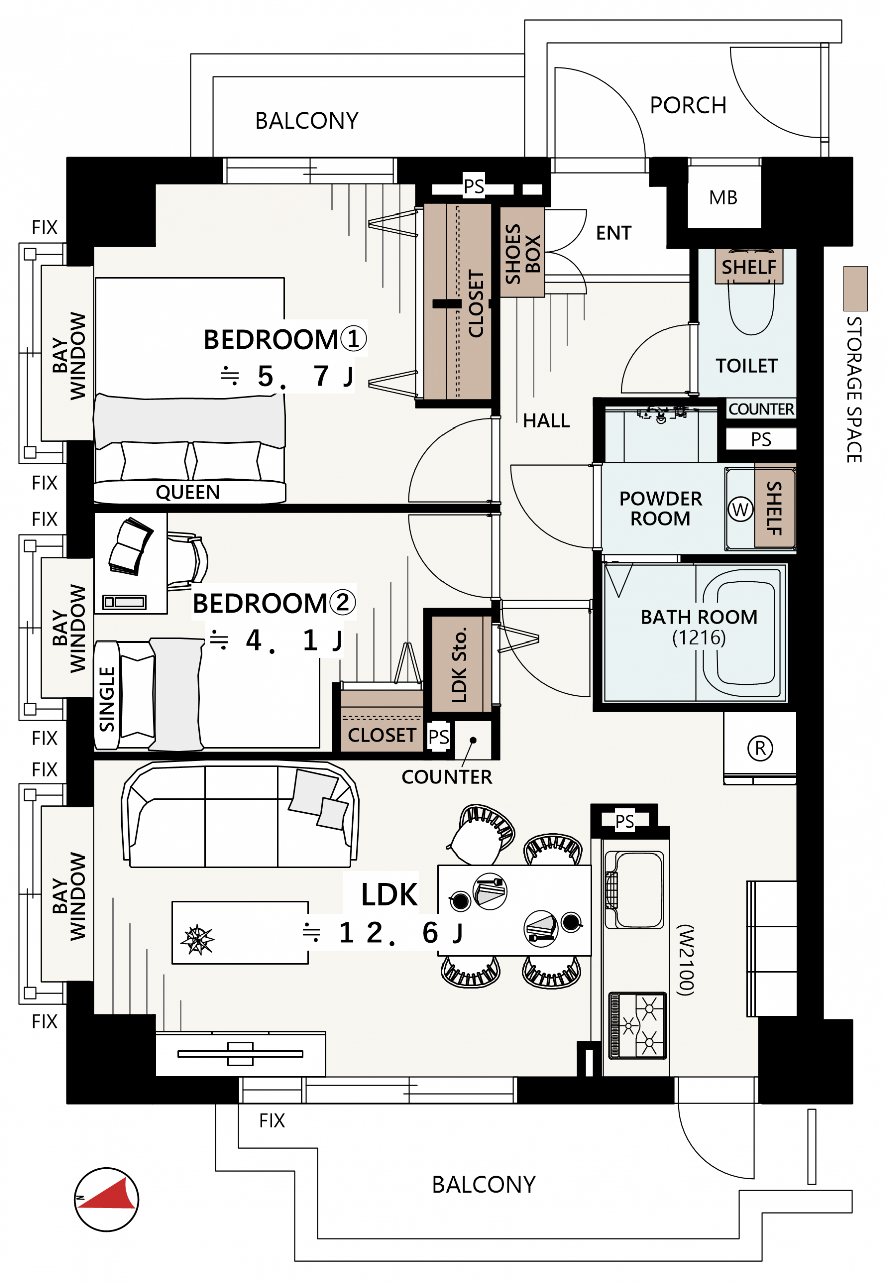 • ยูนิตห้องมุม แสงเข้าสามด้าน! ระเบียงทั้งสองด้าน หน้าต่างแบบเบย์วินโดว์