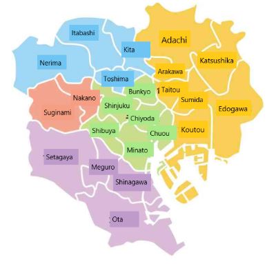 โตเกียวประกอบไปด้วย 23 เขต แบ่งโดยรวมแล้ว พื้นที่สีเขียวในภาพจัดเป็นพื้นที่ใจกลางของโตเกียว และในส่วนพื้นที่ใจกลางสีเขียวนั้นเป็นส่วนที่อยู่ด้านในของรถไฟสายที่รู้จักกันดีอย่างสายยามาโนะเตะ (Yamanote Line)