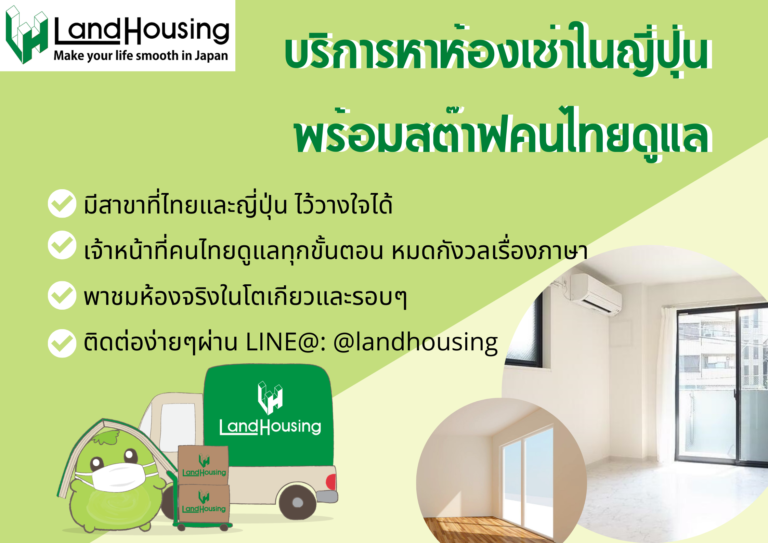 สำหรับท่านที่กำลังมองหาห้องพักในญี่ปุ่น สามารถติดต่อและสอบถามเข้ามาทาง LandHousing ได้เพื่อให้เจ้าหน้าที่นำเสนอห้องตามความต้องการและเงื่อนไขของท่าน และเจ้าหน้าที่ยังสามารถพาไปชมห้องในโตเกียว จิบะ ไซตามะ และคานากาวะ พร้อมทั้งให้คำแนะนำต่างๆที่เป็นประโยชน์ในการเช่าอีกด้วย