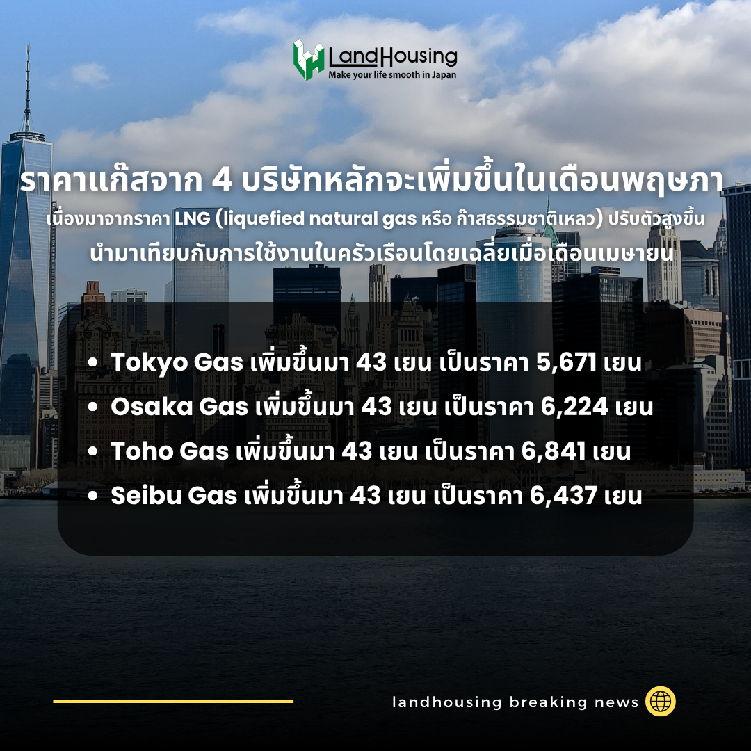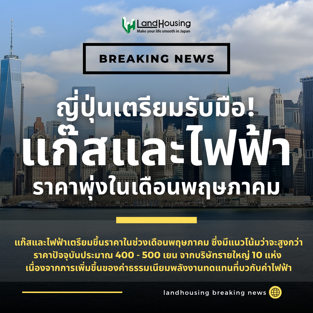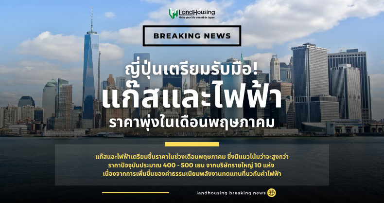 เพิ่งจะมีข่าวด่วนล่าสุดมาว่าแก๊สและไฟฟ้าเตรียมขึ้นราคาในช่วงเดือนพฤษภาคม ซึ่งมีแนวโน้มว่าจะสูงกว่าปัจจุบันประมาณ 400 ถึง 500 เยนจากบริษัทรายใหญ่ 10 แห่ง เนื่องจากการเพิ่มขึ้นของค่าธรรมเนียมพลังงานทดแทนบวกกับค่าไฟฟ้า