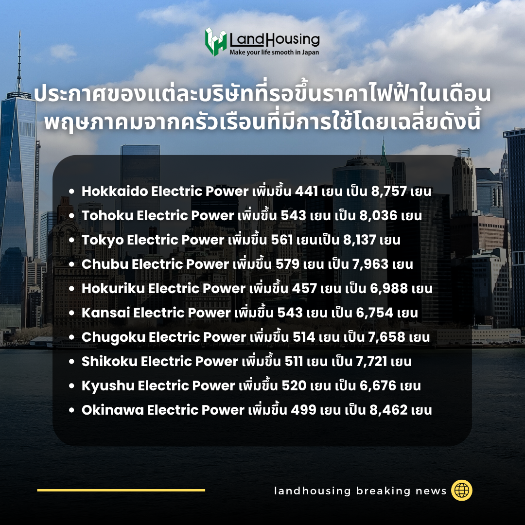 ประกาศของแต่ละบริษัทที่รอขึ้นราคาไฟ้ฟ้าในเดือนพฤษภาคมจากการใช้ในครัวเรือนโดยเฉลี่ยดังนี้