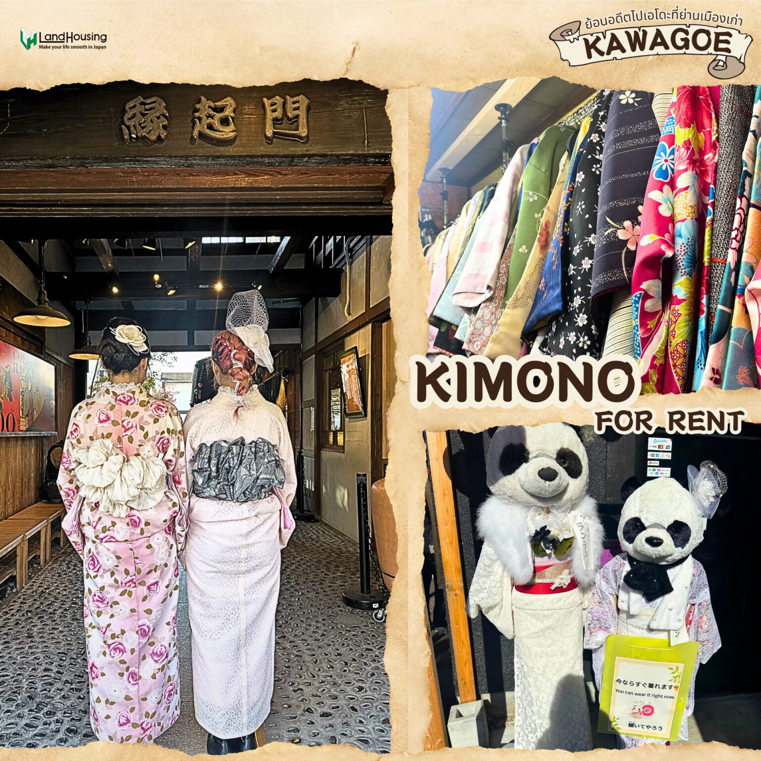 คาวาโกเอะมีถนนคนเดิน Karazukuri ที่น่าสนใจด้วยตึกบ้านรามบ้านช่องแบบสมัยเอโดะ เพื่อให้กลมกลืนไปกับบรรยากาศเมืองเก่าเราไปเช่าชุดกิโมโนมาใส่เดินเล่นกันดีกว่า ร้านเช่ากิโมโนที่เราแนะนำอยู่ติดกับศาลเจ้า Kumano ร้านกิโมโนจะอยู่ชั้นสองของร้านขายถังหูลู่
