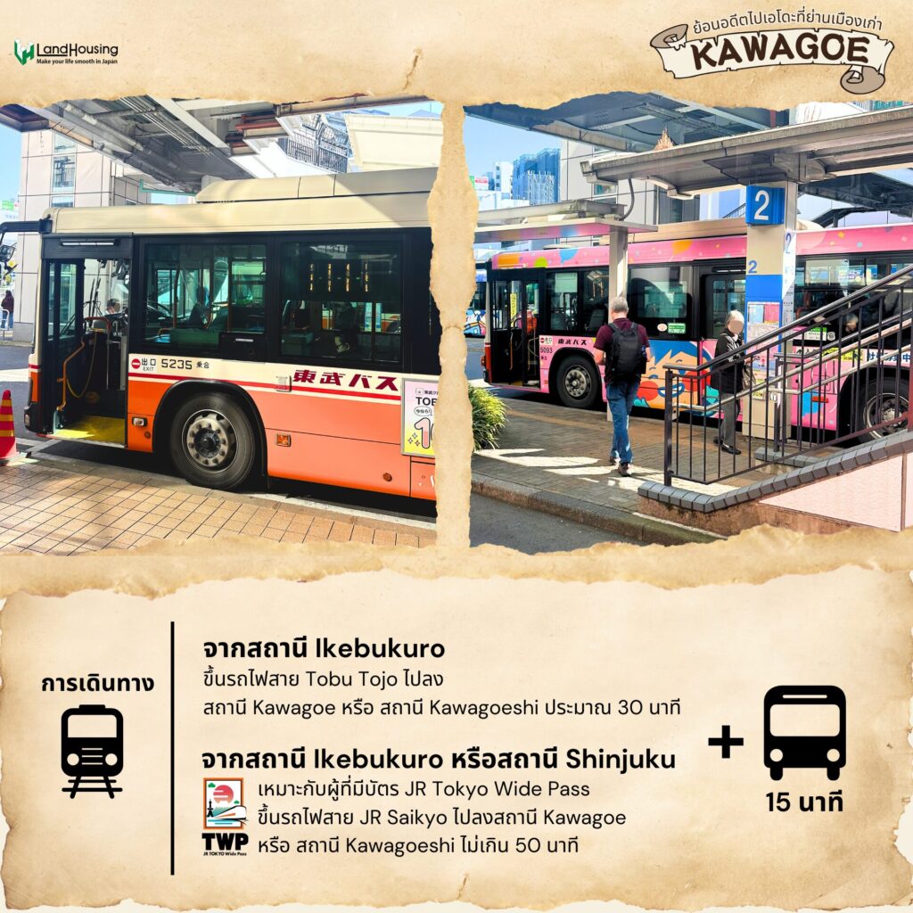 1. เริ่มเดินทางจากสถานี Ikebukuro ขึ้นรถไฟสาย Tobu Tojo Line ไปลง สถานี Kawagoe หรือ สถานี Kawagoeshi ใช้เวลาประมาณ 30 นาที