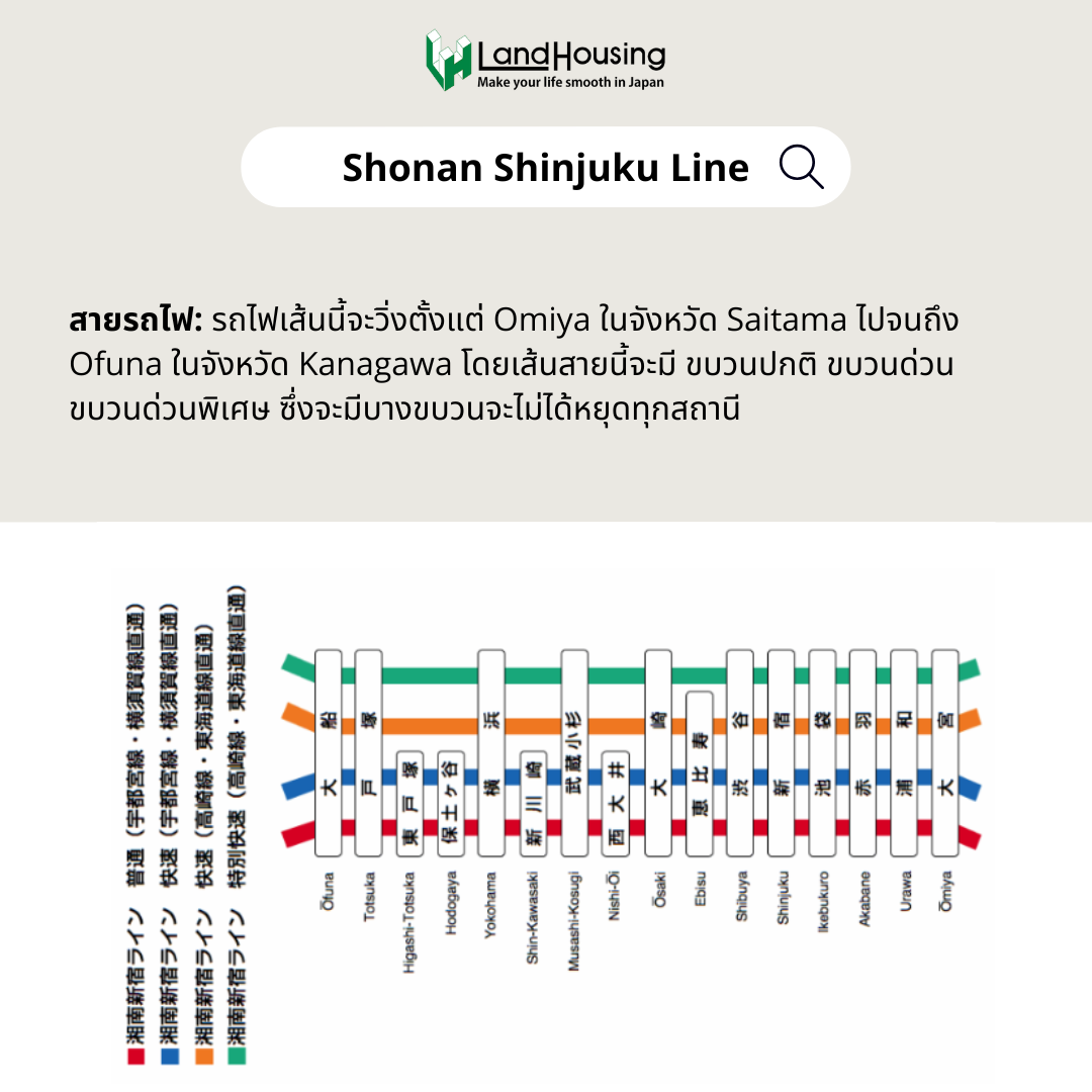 ในสถานีนี้มีรถไฟวิ่งผ่านถึง 4 สาย ได้แก่ 1. JR Keihin Tohoku Line รถไฟสายนี้วิ่งเส้นทางระยะยาว เริ่มจาก Omiya ในจังหวัด Saitama ผ่านสถานีหลักในโตเกียวอย่าง Ueno, Akihabara, Tokyo, Yurakucho, Shinagawa จนไปถึงสถานีสุดท้ายอย่าง Ofuna ในจังหวัด Kanagawa | 2. JR-SaiKyo Line สายรถไฟเส้นนี้จะวิ่งตั้งแต่สถานี Omiya ในจังหวัด Saiyama ไปยังสถานีหลักในตัวเมืองโตเกียว เช่น Ikebukuro, Shinjuku, Shibuya, Ebisu | 3.JR-Takasaki Line รถไฟเส้นนี้จะวิ่งตั้งแต่สถานี Takasaki ในจังหวัด Gunma ไปจนถึงสถานี Tokyo ในจังหวัด Tokyo และ 4.Shonan Shinjuku Line รถไฟเส้นนี้จะวิ่งตั้งแต่ Omiya ในจังหวัด Saitama ไปจนถึง Ofuna ในจังหวัด Kanagawa โดยเส้นสายนี้จะมี ขบวนปกติ ขบวนด่วน ขบวนด่วนพิเศษ ซึ่งจะมีบางขบวนจะไม่ได้หยุดทุกสถานี