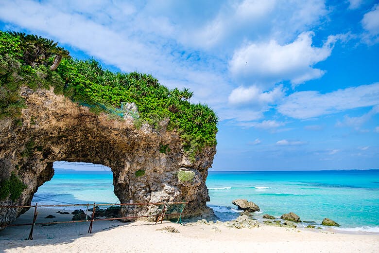 ชายหาดที่ดีที่สุดแห่งหนึ่งของ Miyakojima พร้อมทิวทัศน์อันน่าทึ่ง และซุ้มหินธรรมชาติที่เอื้อต่อการถ่ายภาพที่สวยงาม