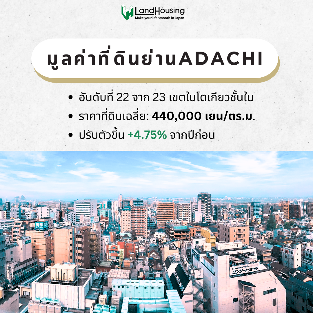 ราคาที่ดิน: เขต Adachi มีมูลค่าที่ดินเฉลี่ยอยู่ที่ 440,000 เยนต่อตารางเมตร ซึ่งถือว่าถูกเป็นอันดับ 22 จาก 23 เขตในโตเกียวชั้นใน