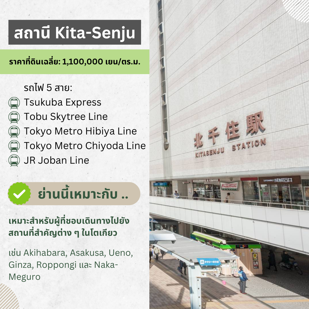 1) สถานี Kita-Senju: ราคาที่ดินเฉลี่ย: 1,100,000 เยนต่อตารางเมตร