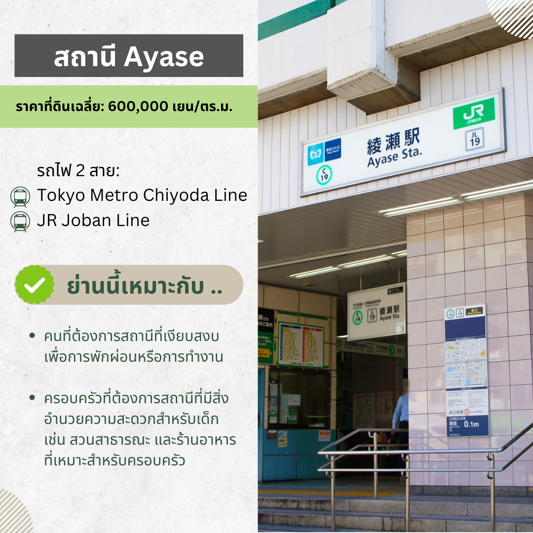 2) สถานี Ayase: ราคาที่ดินเฉลี่ย: 600,000 เยนต่อตารางเมตร