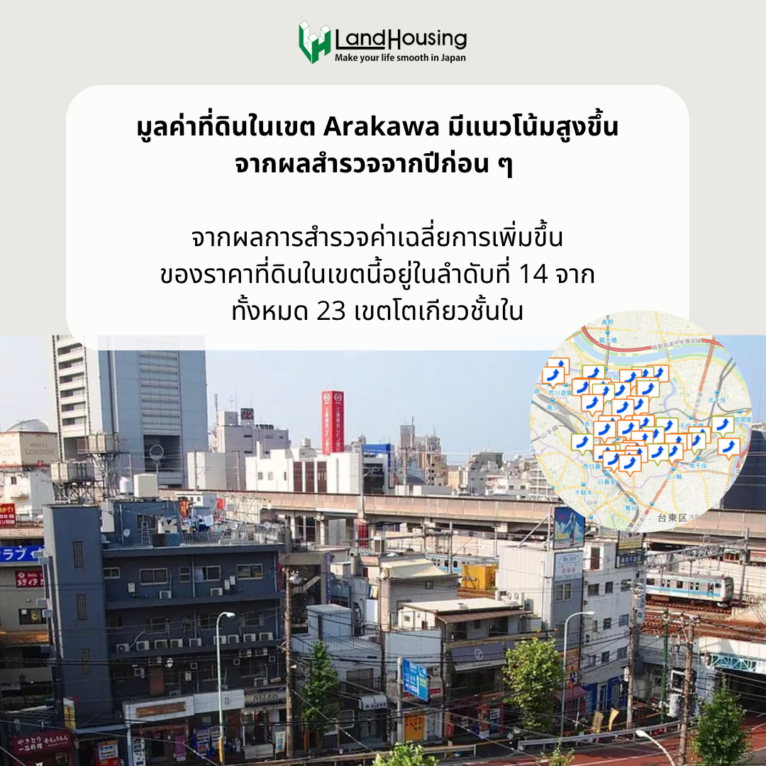 1. ราคาที่ดิน: มูลค่าที่ดินในเขตอารากาวะมีแนวโน้ม สูงขึ้น อย่างต่อเนื่อง จากข้อมูลล่าสุด อยู่ในอันดับที่ 14 จาก 23 เขตในโตเกียวชั้นใน แสดงให้เห็นถึงศักยภาพและโอกาสการลงทุน