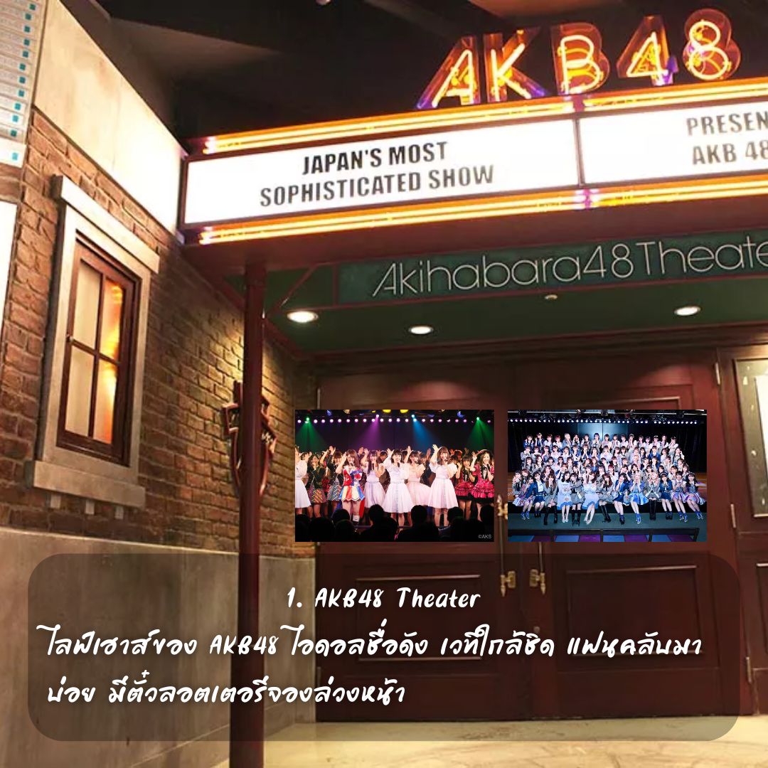 ไลฟ์เฮาส์สำหรับ AKB48 โดยเฉพาะของกลุ่มไอดอลระดับประเทศ ด้วยคอนเซ็ปต์ “ไอดอลที่คุณสามารถพบได้” เป็นศูนย์รวมของป๊อปคัลเจอร์ AKB48 Theater เป็นสถานที่ที่ AKB48 หนึ่งในกลุ่มไอดอลที่กำลังได้รับความนิยมมากที่สุดในปัจจุบันถือกำเนิดขึ้น