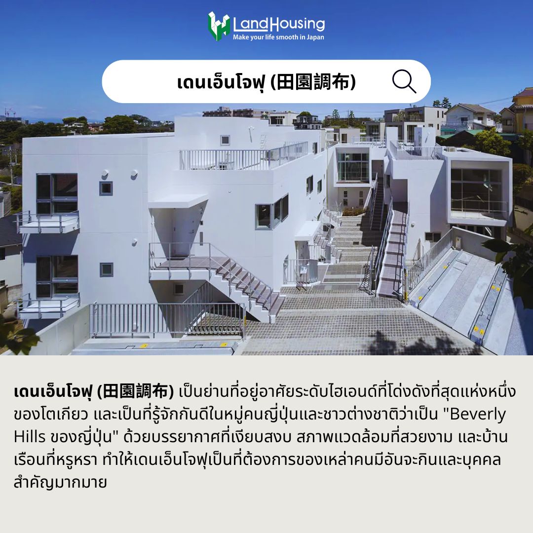 หากพูดถึงโอตะแล้ว จะไม่พูดถึงเดนเอ็นโจฟุไม่ได้ เดนเอ็นโจฟุเป็นย่านที่อยู่อาศัยระดับไฮเอนด์ที่มีชื่อเสียงโด่งดัง ด้วยบรรยากาศที่เงียบสงบ สภาพแวดล้อมที่สวยงาม และบ้านเรือนที่หรูหรา ทำให้เดนเอ็นโจฟุเป็นที่ต้องการของเหล่าคนมีอันจะกินและบุคคลสำคัญมากมาย การลงทุนในอสังหาริมทรัพย์บริเวณนี้จึงถือเป็นการลงทุนระยะยาวที่คุ้มค่า
