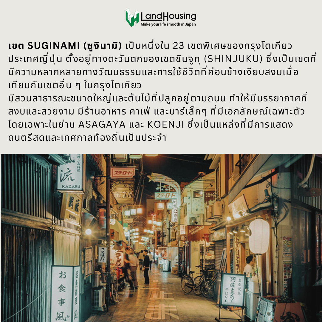 ซูงินามิ เป็นหนึ่งในเขตพิเศษของกรุงโตเกียว ที่มีชื่อเสียงในเรื่องของความเงียบสงบ สภาพแวดล้อมที่เป็นธรรมชาติ และวิถีชีวิตที่เรียบง่าย หากคุณกำลังมองหาที่อยู่อาศัยหรือสถานที่พักผ่อนหย่อนใจที่ห่างไกลจากความวุ่นวายของเมืองใหญ่ ซูงินามิคือคำตอบ