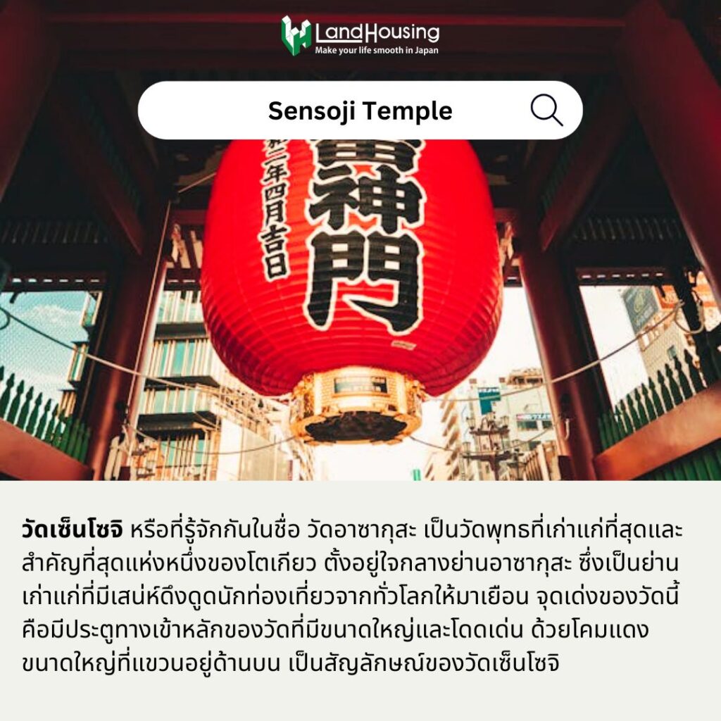 1. วัดเซ็นโซจิ: วัดเก่าแก่ที่มีชื่อเสียงที่สุดแห่งหนึ่งของโตเกียว ตั้งอยู่ริมแม่น้ำสุมิดะ มีประตูทางเข้าที่โดดเด่นและถนนนากามิเซะที่เต็มไปด้วยร้านค้าขายของที่ระลึก