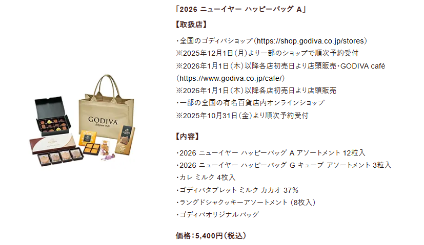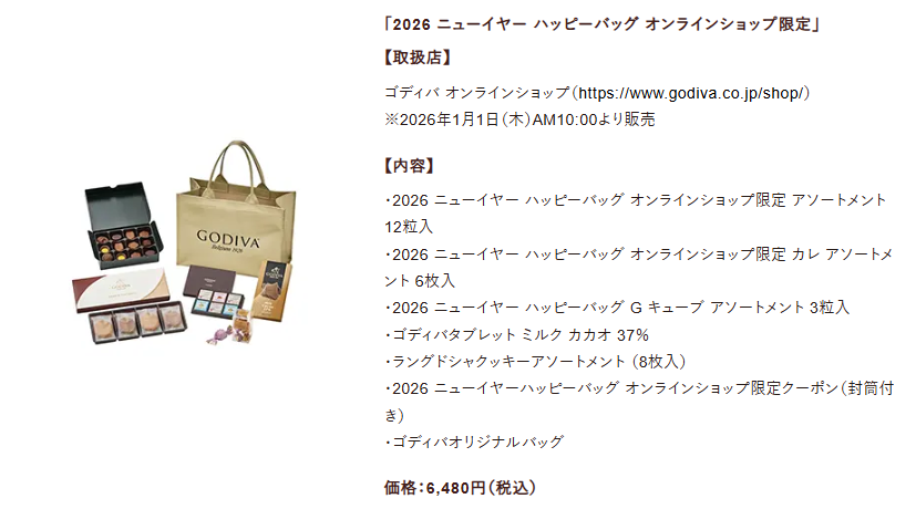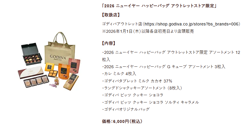 ราคา: 5,400 เยน – 6,480 เยน (รวมภาษี) ดูข้อมูลเพิ่มเติมได้ที่หน้าพิเศษของถุงโชคดี Godiva