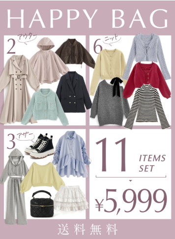 ราคา: 1,999 เยน – 5,999 เยน (รวมภาษี) คลิกเพื่อดูรายละเอียดเพิ่มเติม – ถุงโชคดี GRL HAPPY BAG 11 ITEMS SET / GRL HAPPY BAG 5 ITEMS SET