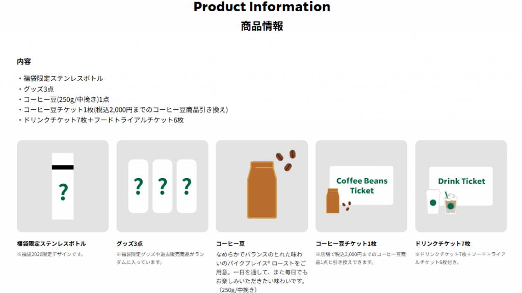 ถุงโชคดีของ Starbucks ในปีนี้ประกอบด้วย กระบอกน้ำสแตนเลสรุ่นลิมิเต็ดอิดิชั่น สินค้าแบบสุ่ม 3 รายการ เมล็ดกาแฟ 250 g คูปองส่วนลดเมื่อซื้อเมล็ดกาแฟราคา 2,000 เยนขึ้นไป 1 ใบ คูปองเครื่องดื่ม 7 ใบ และ คูปองทดลองรับประทานอาหาร 6 ใบ