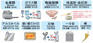 ขยะประเภทนี้ไม่สามารถกำจัดด้วยการเผา เช่น โลหะ เครื่องแก้ว ถ้วยเซรามิก เครื่องวัดอุณหภูมิ อะลูมิเนียมฟอยล์ ไคโระ (หรืออุปกรณ์ให้ความอบอุ่นแบบใช้แล้วทิ้ง) ของมีคม ร่ม หรือข้าวของเครื่องใช้ภายในบ้านขนาดเล็ก หรือสิ่งของที่ทนความร้อน การแยกขยะประเภทนี้ช่วยลดความเสี่ยงต่อการเกิดอุบัติเหตุระหว่างเก็บขยะและช่วยให้การกำจัดทำได้อย่างปลอดภัยและถูกต้อง