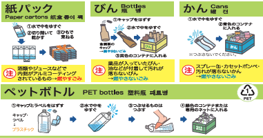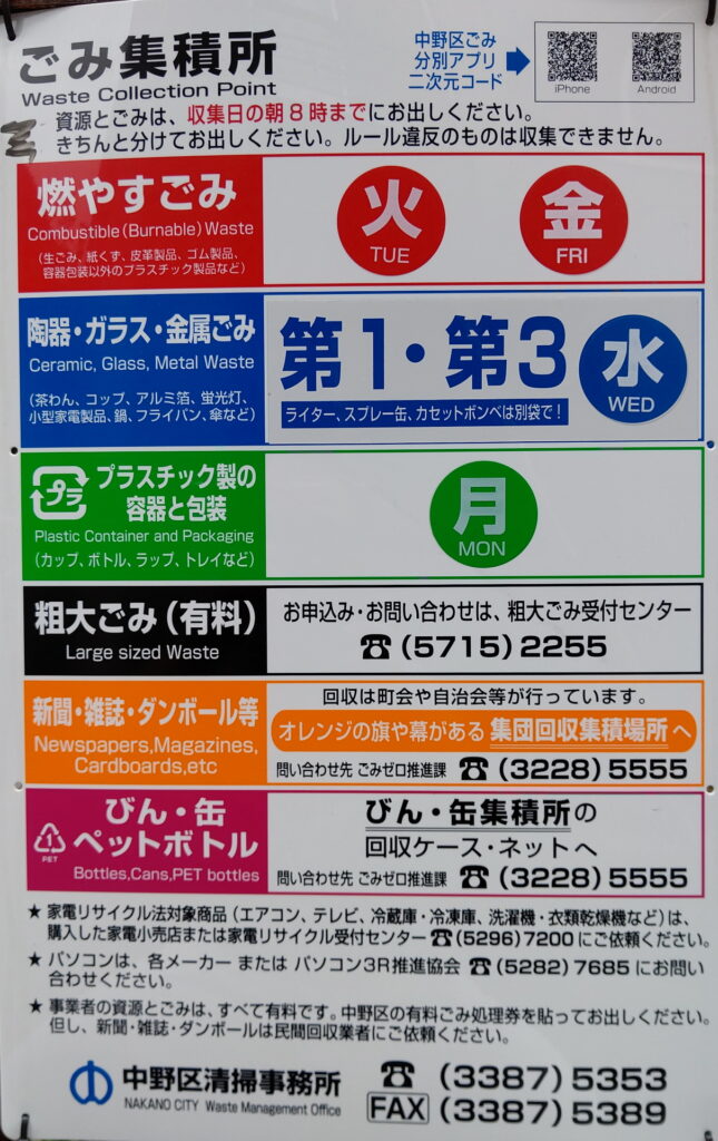 กฎการทิ้งขยะที่ประเทศญี่ปุ่นแตกต่างจากที่ประเทศไทย คือ ผู้พักอาศัยในแต่ละเขต จะต้องตรวจสอบการจำแนกประเภทขยะ สถานที่ตั้งของจุดทิ้งขยะ วันและเวลาที่ควรนำขยะมาทิ้ง และวันที่หน่วยงานจะเข้ามาเก็บ โดยการสอบถามผู้ดูแลที่พัก ตรวจสอบได้จากโบชัวร์ หรือช่องทางโซเชียลมีเดียของแต่ละเขตที่ตนอยู่ ซึ่งถือเป็นข้อมูลสำคัญที่ช่วยให้การจัดการขยะเป็นไปอย่างถูกต้อง ตัวอย่างโบชัวร์ต่อไปนี้จัดทำโดยสำนักงานเขต ใช้เพื่อแจ้งให้ประชาชนทราบตารางการจัดเก็บขยะของพื้นที่ รูปแบบการนำเสนอคล้ายกัน คือ แบ่งเป็นหมวดหมู่ของขยะ พร้อมระบุวันเก็บเป็นรายสัปดาห์อย่างชัดเจน