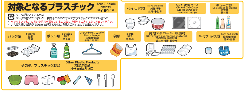 ขยะประเภทนี้ต้องแยกทิ้งจากขยะทั่วไป เพราะสามารถนำกลับมาหลอม แล้วผลิตขึ้นมาใหม่ได้ เช่น บรรจุภัณฑ์ที่ทำจากพลาสติกอย่าง ภาชนะพลาสติก ถ้วยพลาสติก ไม้แขวนเสื้อ กล่องใส่ไข่ ฝาและฉลากพลาสติก ซีดี/ดีวีดี หลอดยาสีฟัน บับเบิ้ลพลาสติกกันกระแทก ขวดน้ำยาสระผม ก่อนทิ้งควรเทของเหลวออก ล้างให้สะอาด แต่หากเป็นขยะพลาสติกที่ล้างทำความสะอาดแล้วยังมีคลาบหรือกลิ่นไม่พึงประสงค์หลงเหลืออยู่ ให้นำไปทิ้งรวมกับ ขยะเผาได้  = Burnable Waste (可燃ゴミ)