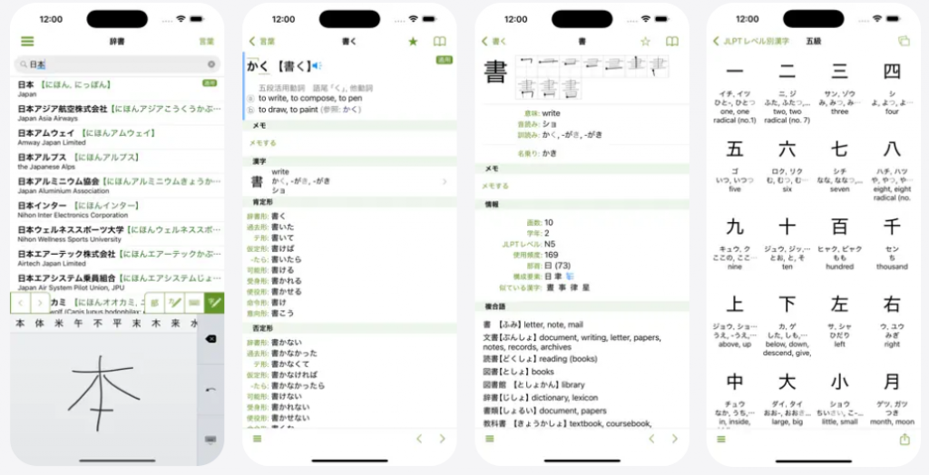 • มีรายการตัวอักษรฮิรากะนะ คาตะกะนะ และคันจิแยกตามหมวดให้เรียนรู้