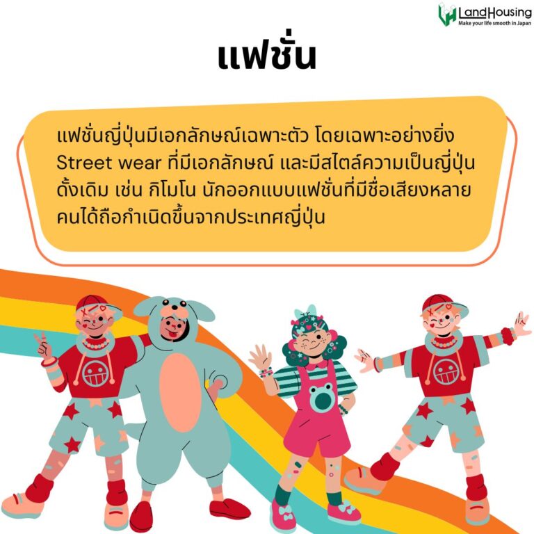 4.แฟชั่น: แฟชั่นญี่ปุ่นมีเอกลักษณ์เฉพาะตัว โดยเฉพาะอย่างยิ่ง Street wear ที่มีเอกลักษณ์ และมีสไตล์ความเป็นญี่ปุ่นดั้งเดิม เช่น กิโมโน นักออกแบบแฟชั่นที่มีชื่อเสียงหลายคนได้ถือกำเนิดขึ้นจากประเทศญี่ปุ่น เช่น Yohji Yamamoto ซึ่งเป็นแฟชั่นดีไซเนอร์ชื่อดังที่รังสรรค์ผลงานทั้งที่ โตเกียว และที่ปารีส เขาเป็นที่รู้จักในเรื่องการตัดเย็บที่ล้ำยุคซึ่งมีความสวยงามของการออกแบบสไตล์ญี่ปุ่น