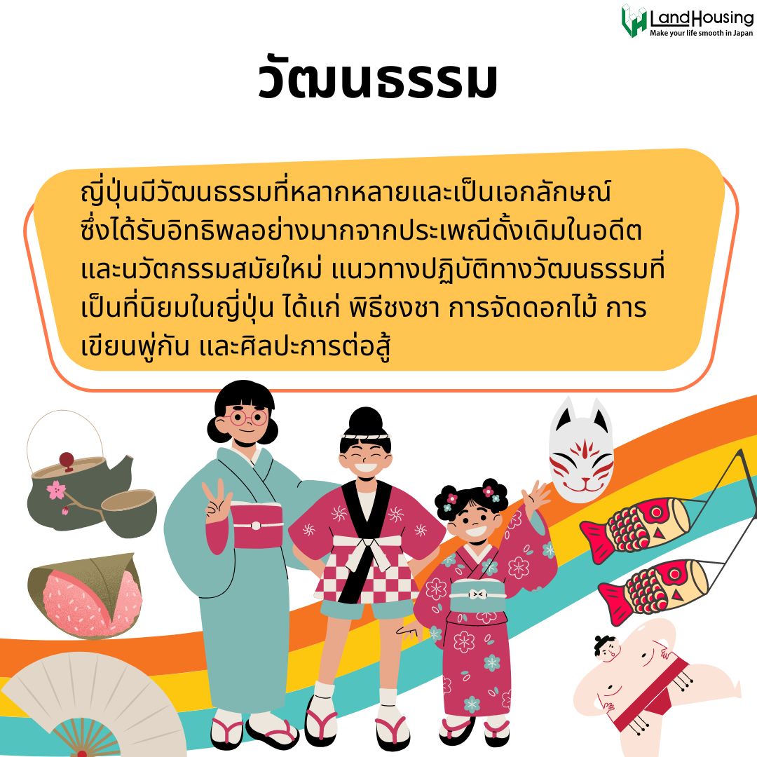 1.วัฒนธรรม: ญี่ปุ่นมีวัฒนธรรมที่หลากหลายและเป็นเอกลักษณ์ ซึ่งได้รับอิทธิพลอย่างมากจากประเพณีดั้งเดิมในอดีต และนวัตกรรมสมัยใหม่ แนวทางปฏิบัติทางวัฒนธรรมที่เป็นที่นิยมในญี่ปุ่น ได้แก่ พิธีชงชา การจัดดอกไม้ การเขียนพู่กัน และศิลปะการต่อสู้
