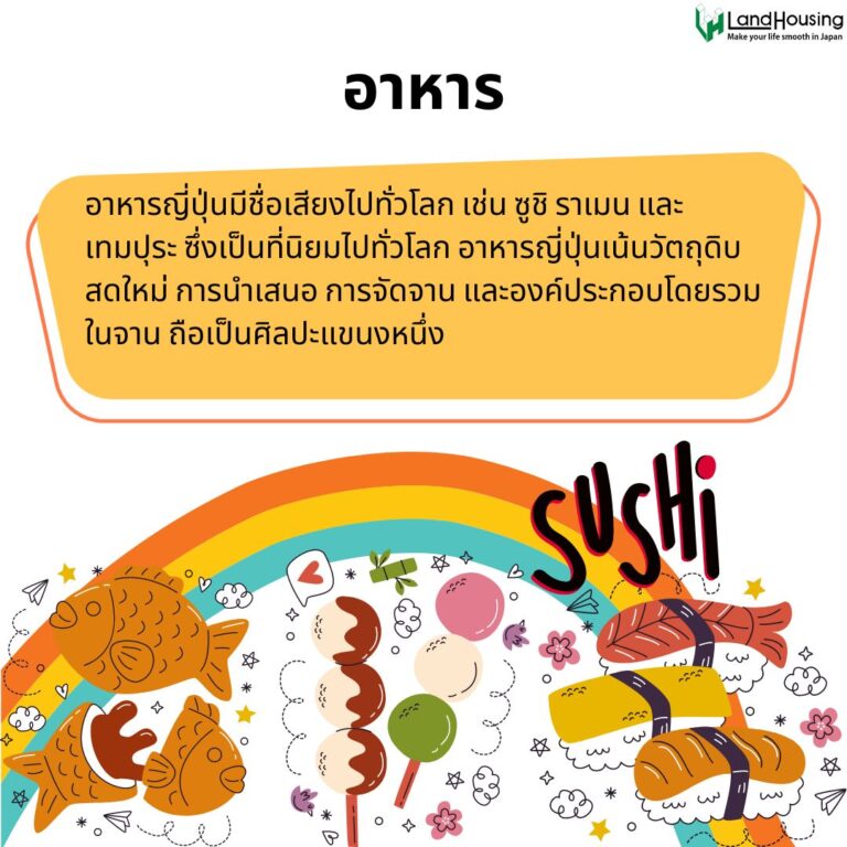3.อาหาร: อาหารญี่ปุ่นมีชื่อเสียงไปทั่วโลก เช่น ซูชิ ราเมน และเทมปุระ ซึ่งเป็นที่นิยมไปทั่วโลก อาหารญี่ปุ่นเน้นวัตถุดิบสดใหม่ การนำเสนอ การจัดจาน และองค์ประกอบโดยรวมในจาน ถือเป็นศิลปะแขนงหนึ่ง