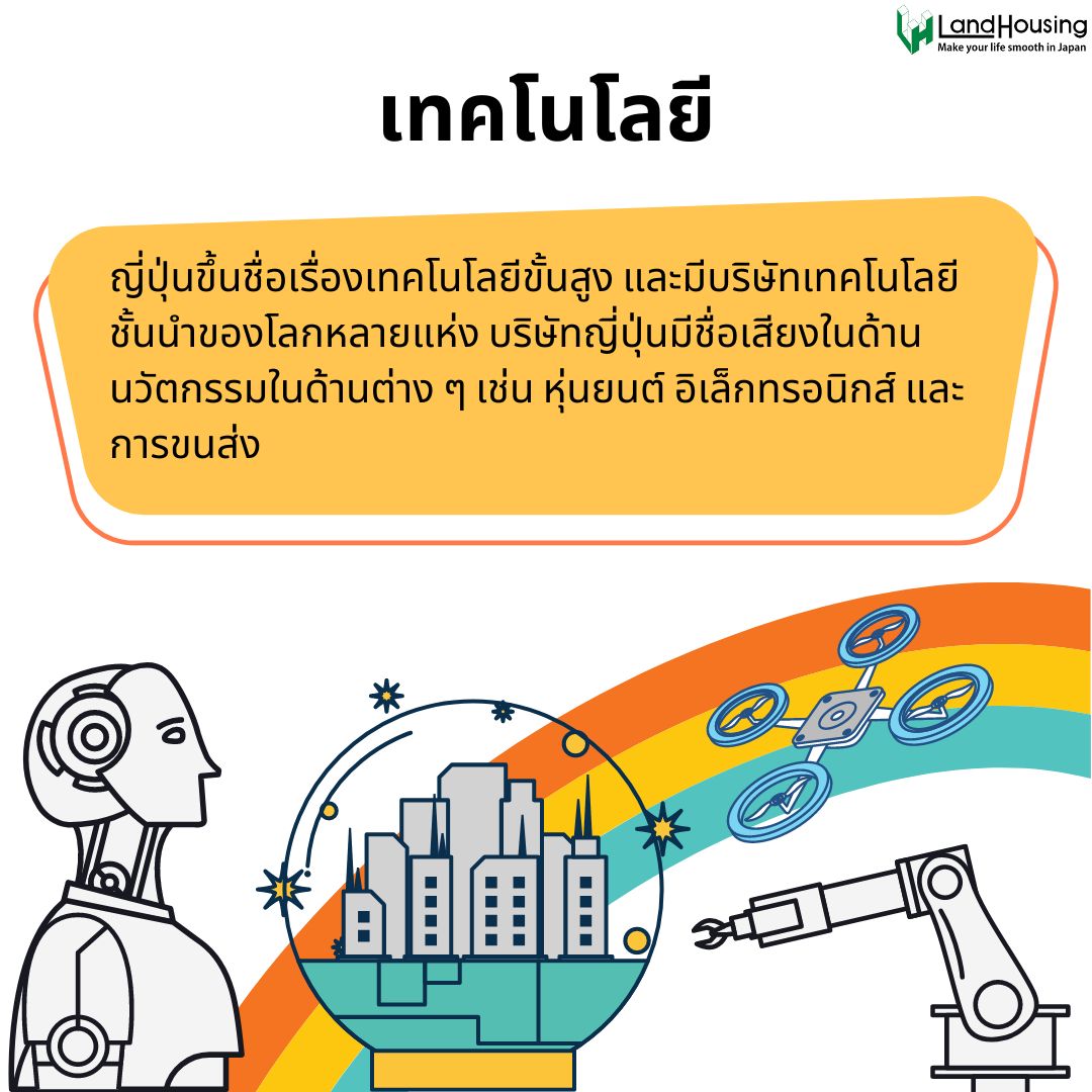 2.เทคโนโลยี: ญี่ปุ่นขึ้นชื่อเรื่องเทคโนโลยีขั้นสูง และมีบริษัทเทคโนโลยีชั้นนำของโลกหลายแห่ง บริษัทญี่ปุ่นมีชื่อเสียงในด้านนวัตกรรมในด้านต่าง ๆ เช่น หุ่นยนต์ อิเล็กทรอนิกส์ และการขนส่ง