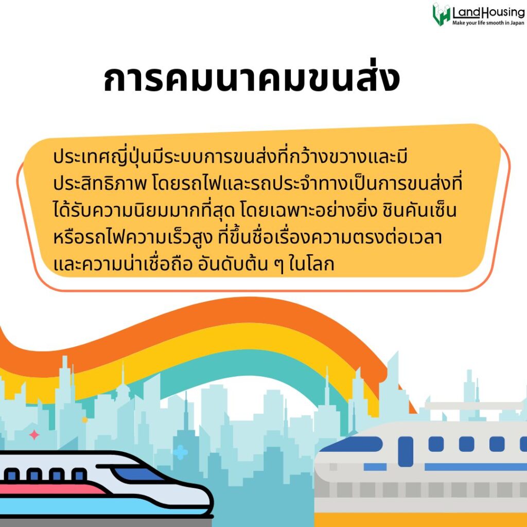 8.การคมนาคมขนส่ง: ประเทศญี่ปุ่นมีระบบการขนส่งที่กว้างขวางและมีประสิทธิภาพ โดยรถไฟและรถประจำทางเป็นการขนส่งที่ได้รับความนิยมมากที่สุด โดยเฉพาะอย่างยิ่ง ชินคันเซ็น หรือรถไฟความเร็วสูง ที่เดินทางระหว่างเมืองใหญ่ๆ ในญี่ปุ่น และขึ้นชื่อเรื่องความตรงต่อเวลา และความน่าเชื่อถือ อันดับต้น ๆ ในโลก