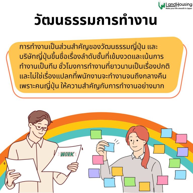 6.วัฒนธรรมการทำงาน: การทำงานเป็นส่วนสำคัญของวัฒนธรรมญี่ปุ่น และบริษัทญี่ปุ่นขึ้นชื่อเรื่องลำดับชั้นที่เข้มงวดและเน้นการทำงานเป็นทีม ชั่วโมงการทำงานที่ยาวนานเป็นเรื่องปกติ และไม่ใช่เรื่องแปลกที่พนักงานจะทำงานจนถึงกลางคืน เพราะคนญี่ปุ่น ให้ความสำคัญกับการทำงานอย่างขยันขันแข็ง และมีประสิทธิภาพ