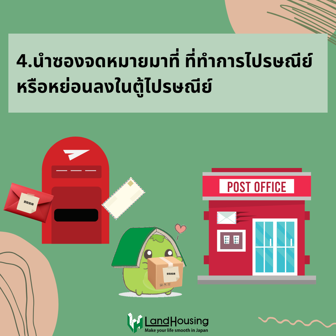 4.นำซองจดหมายมาที่ที่ทำการไปรษณีย์หรือหย่อนลงในตู้ไปรษณีย์