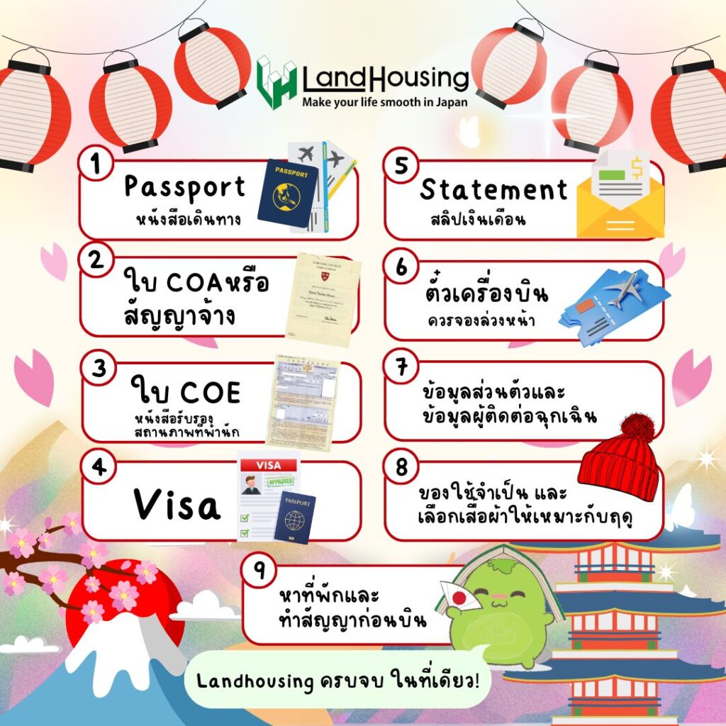 ก่อนเดินทางควรเตรียมเอกสารสำคัญ เช่น ตั๋วเครื่องบิน, Passport (ตัวจริงและสำเนา), วีซ่า, ใบ COA หรือ เอกสารการจ้างงาน (สำหรับคนที่ไปทำงาน), ใบ COE หนังสือรับรอง, สลิปเงินเดือน, ข้อมูลส่วนตัวและข้อมูลผู้ติดต่อฉุกเฉิน, ประกันสุขภาพ เป็นต้น ของที่แนะนำให้พกมาจากไทย เช่น เสื้อผ้าที่เหมาะกับฤดูกาล ของใช้ส่วนตัว ตำราเรียน และอื่นๆ ที่จำเป็นสำหรับจุดประสงค์ในการมาประเทศญี่ปุ่น ยาแก้หวัด ยาลดไข้ (คลิกเพื่ออ่านสรุป NEW ! ยาต้องห้ามนำเข้าประเทศญี่ปุ่น)