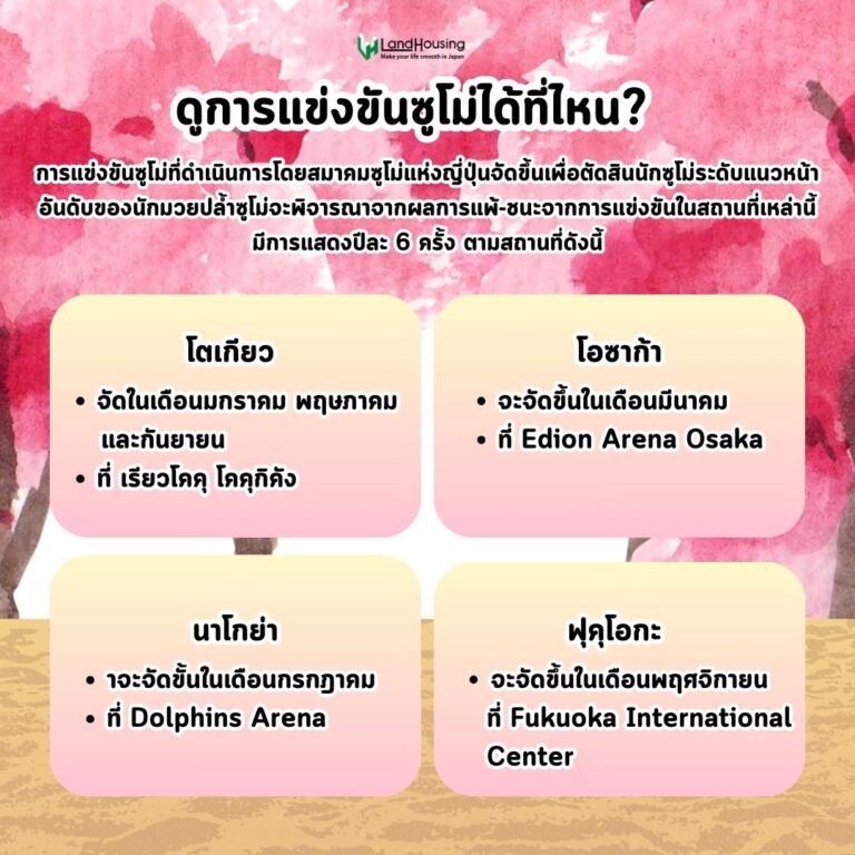 ถ้าพูดถึงกีฬาญี่ปุ่นแล้วละก็ ซูโม่น่าจะเป็นหนึ่งในกีฬาที่เพื่อน ๆ นึกออกเป็นอย่างแรก ๆ อย่างแน่นอน ด้วยรูปร่างอันสูงใหญ่ นุ่งผ้าน้อยชิ้นพร้อมทรงผมอันเป็นเอกลักษณ์ของนักซูโม่ ทำให้หลายคนจดจำกีฬาญี่ปุ่นชนิดนี้ได้เป็นอย่างดี วันนี้พวกเรา LandHousing จะมาแนะนำให้รู้จักกับซูโม่ให้มากกว่าที่เคยครับ