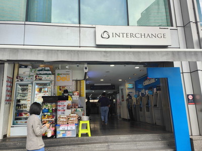 「Interchange21ビルは左手にあります。進むとビルの連結出入口となります。」