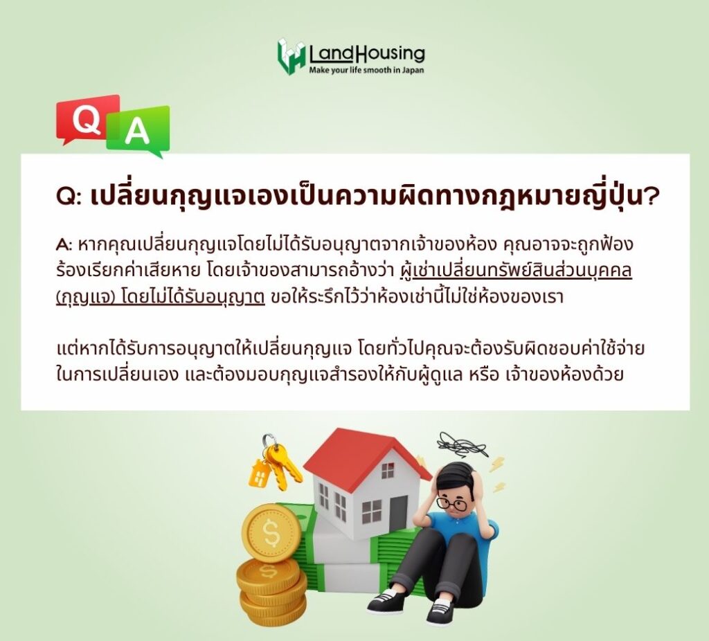 นอกจากนี้ หากคุณเปลี่ยนกุญแจโดยไม่ได้รับอนุญาต คุณอาจถูกฟ้องร้องเรียกค่าเสียหาย เนื่องจากผู้เช่าเปลี่ยนแปลงทรัพย์สินส่วนบุคคล (กุญแจ) โดยไม่ได้รับอนุญาต ขอให้ระรึกไว้ว่านี่เป็นห้องเช่านี้ไม่ใช่ของเรา