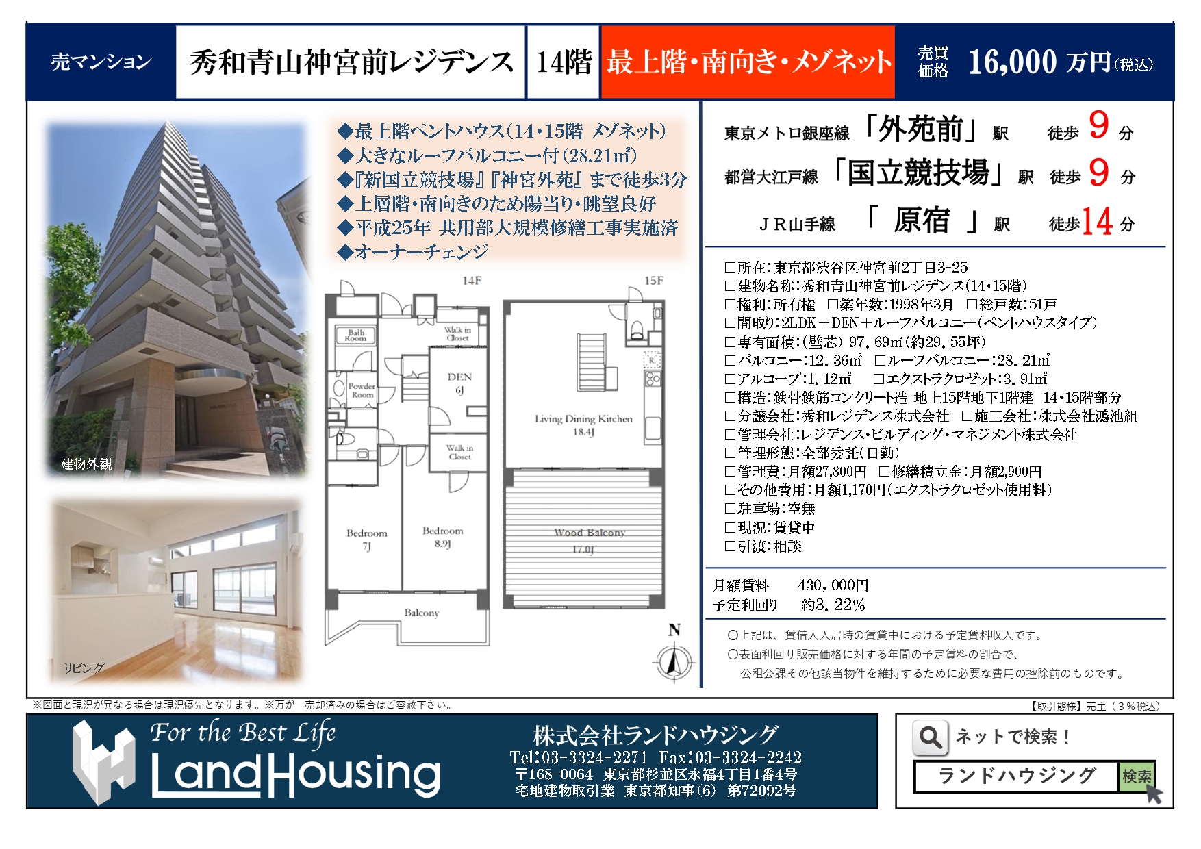 รายรับประเมินต่อปี : 5,160,000 เยน (ปัจจุบันค่าเช่าเดือนละ 430,000 เยน)